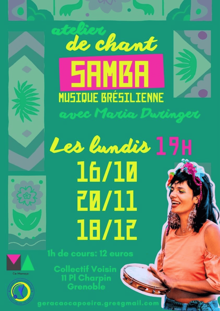 Chant de samba 27/01/2025 Date : 27 janvier 2025Heure : 19hLieu: Collectif Voisin / 11 place Charpin - GrenobleAtelier de chant de Samba animé par Maria Duringer. Tarif : 12€ Pour plus d’informations contactez nous par mail : geracaocapoeira.gre@gmail.com