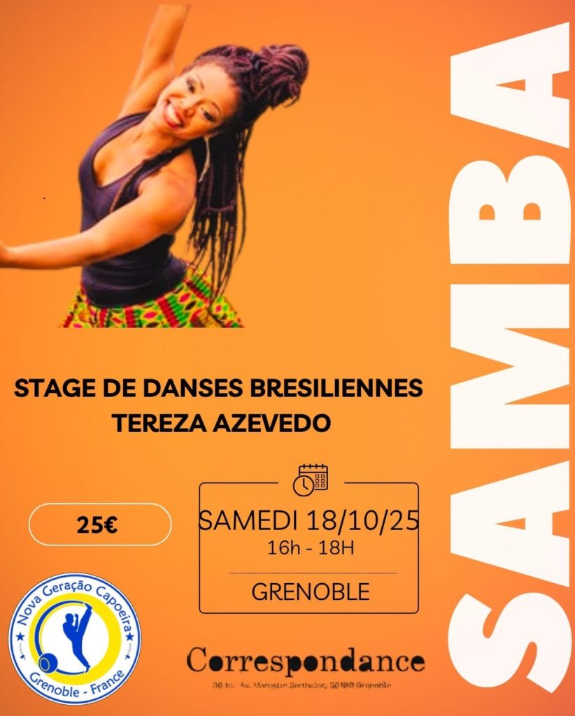 Stage de samba Date : 29 mars 2025Heure : 15h - 17hLieu: La Correspondance - 30 bis avenue Marcelin Berthelot - GrenobleStage de Samba animé par Tereza Azevedo. 2h de cours : 25€ pour plus d'informations contactez nous par mail : geracaocapoeira.gre@gmail.com
